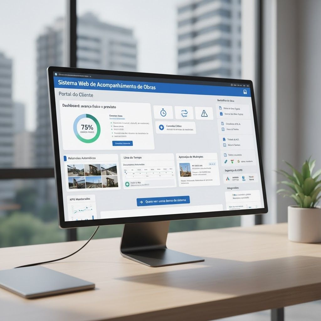 Portal digital com fotos, cronograma, pendências e indicadores de avanço físico — tudo documentado e acessível 24h.